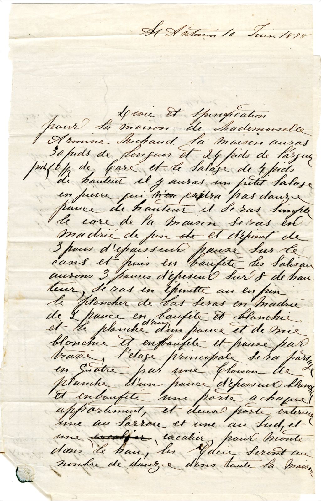 Marché entre François Soucy et Armine Michaud pour la construction d'une maison en bois, 10 juin 1878, Archives nationales à Rimouski, Fonds François Soucy, (01R,P57,D14,P1).