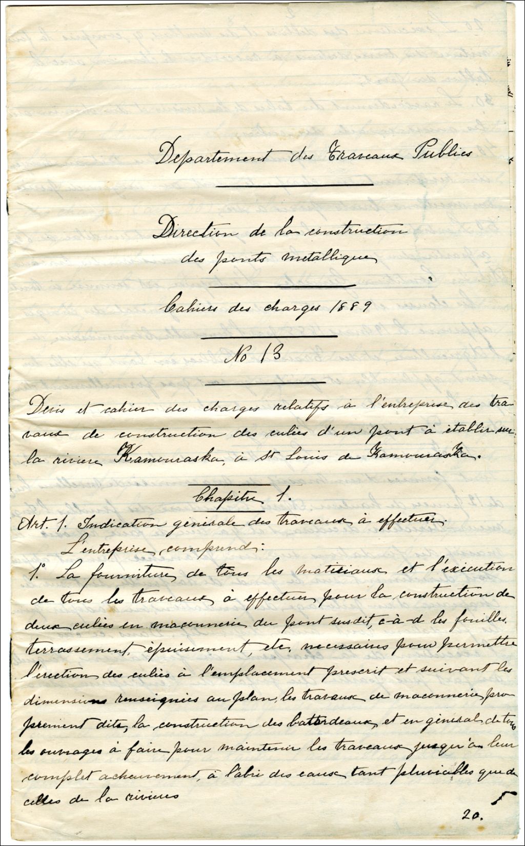 Le document émane du département des travaux publics, direction de la construction des ponts méralliques. Il inclus le chaier des charges de 1889, no. 13, avec désignation des charges et des fournitures