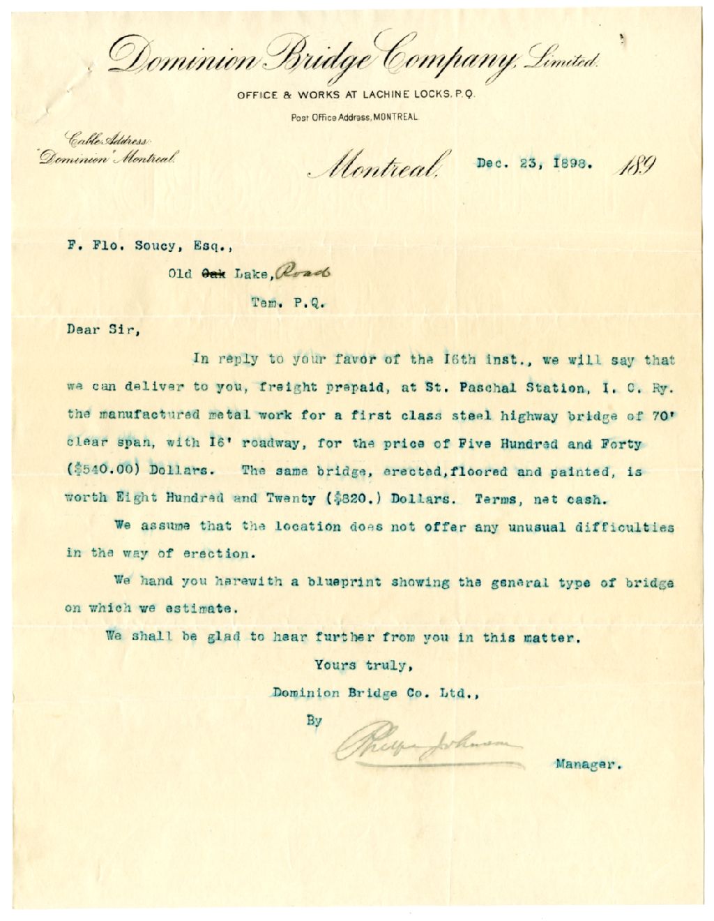 Lettre de P. Johnson directeur de la Dominion Bridge Company à François Soucy de Old Lake Road