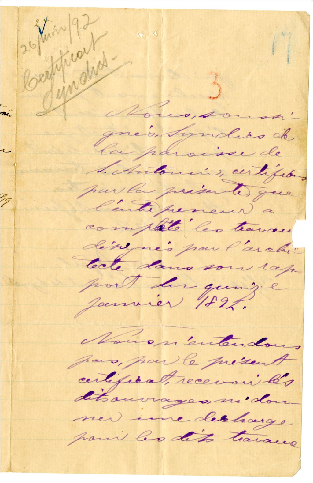 Certificat attestant l'accomplissement des travaux stipulés dans le rapport de David Ouellet le 15 janvier 1892 sans recevoir, ni donner décharge pour les travaux, 26 juin 1892, Archives nationales à Rimouski, Fonds François Soucy, (01R,P57,D7,P20).