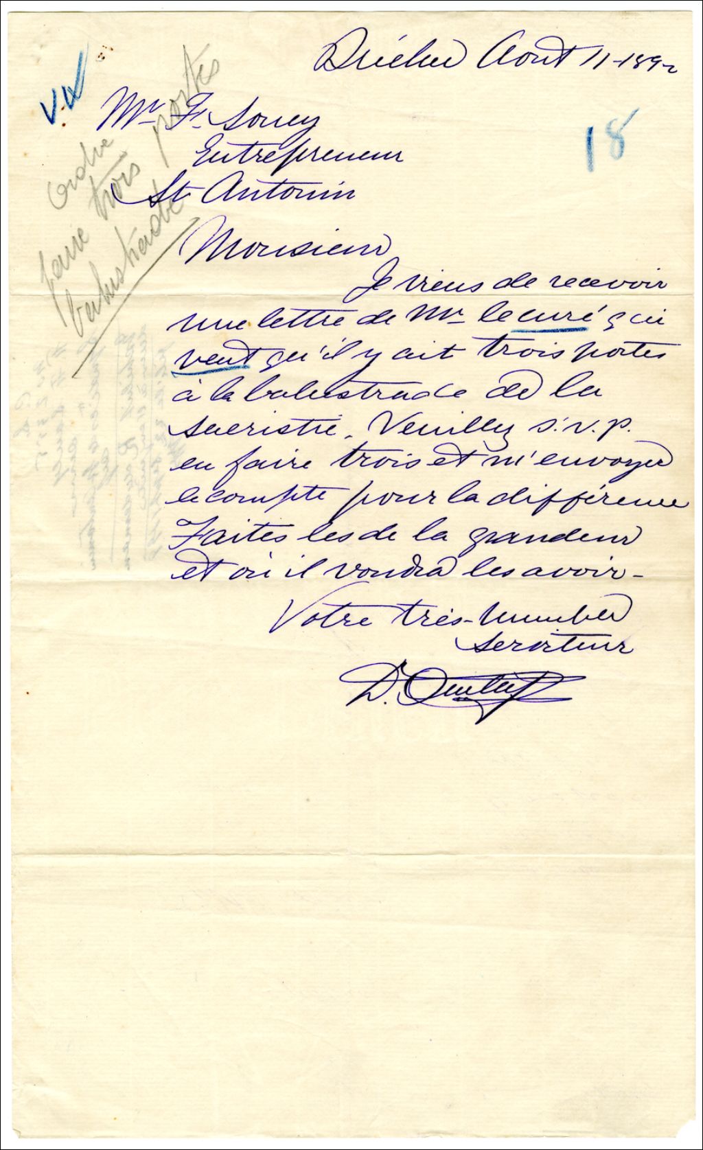 Ordre à l'entrepreneur de David Ouellet de faire 3 portes à la balustrade de la sacristie à la demande du curé, 11 août 1892, Archives nationales à Rimouski, Fonds François Soucy, (01R,P57,D7,P21).