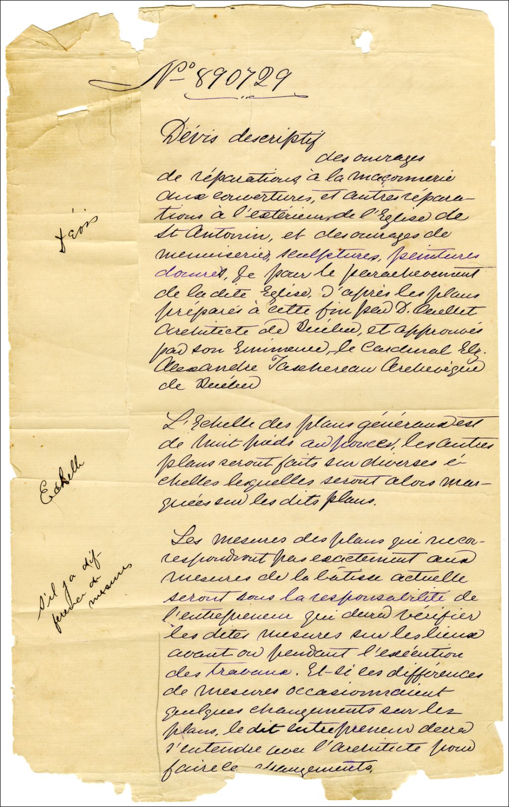Devis descriptif détaillé de la réfection et du parachèvement de l'église, 10 décembre 1889, Archives nationales à Rimouski, Fonds François Soucy, (01R,P57,D7,P3).