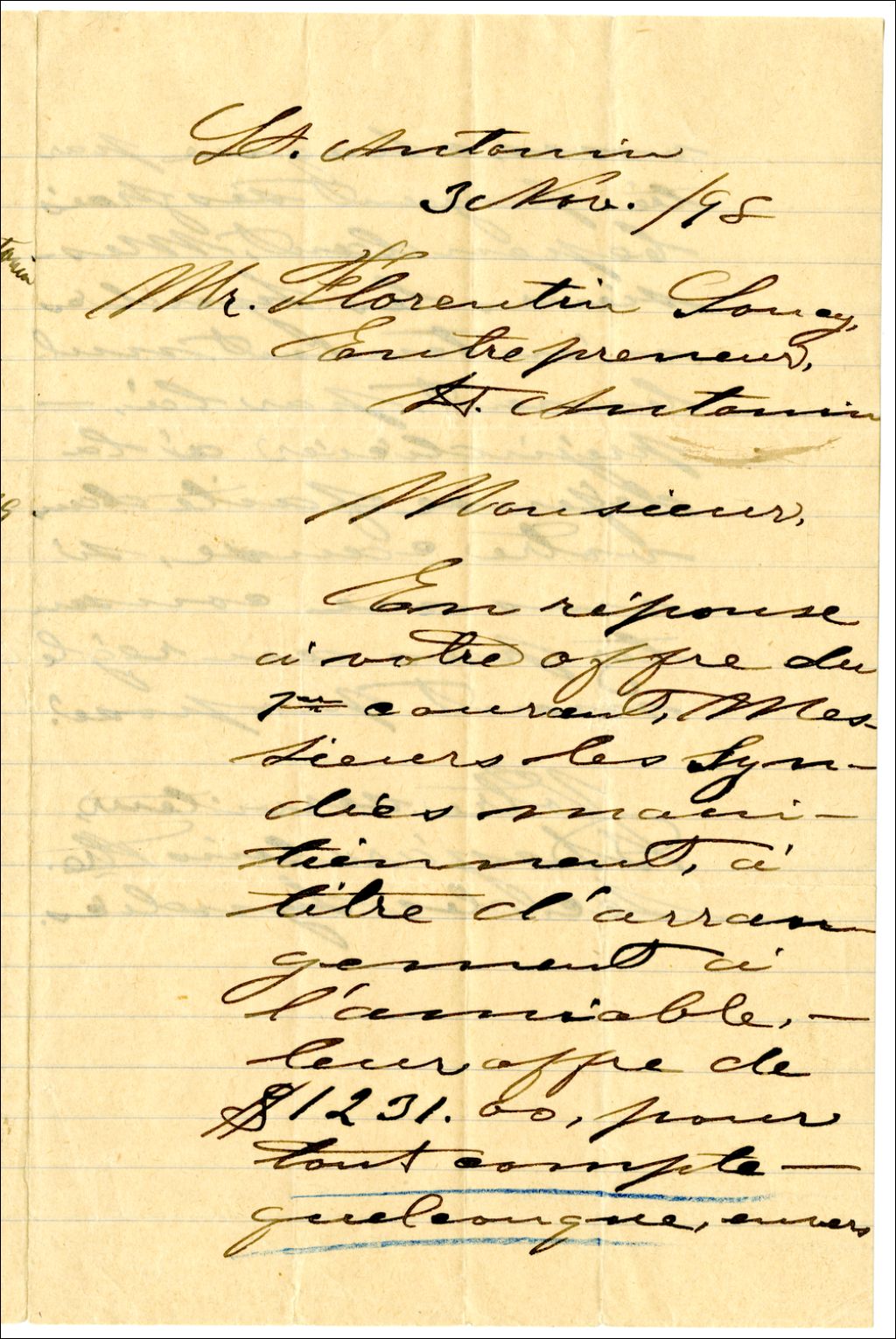 Réponses des syndics maintenant l'offre initiale sans autre réserve comme le voudrait l'entrepreneur, 3 novembre 1898, Archives nationales à Rimouski, Fonds François Soucy, (01R,P57,D7,P40).