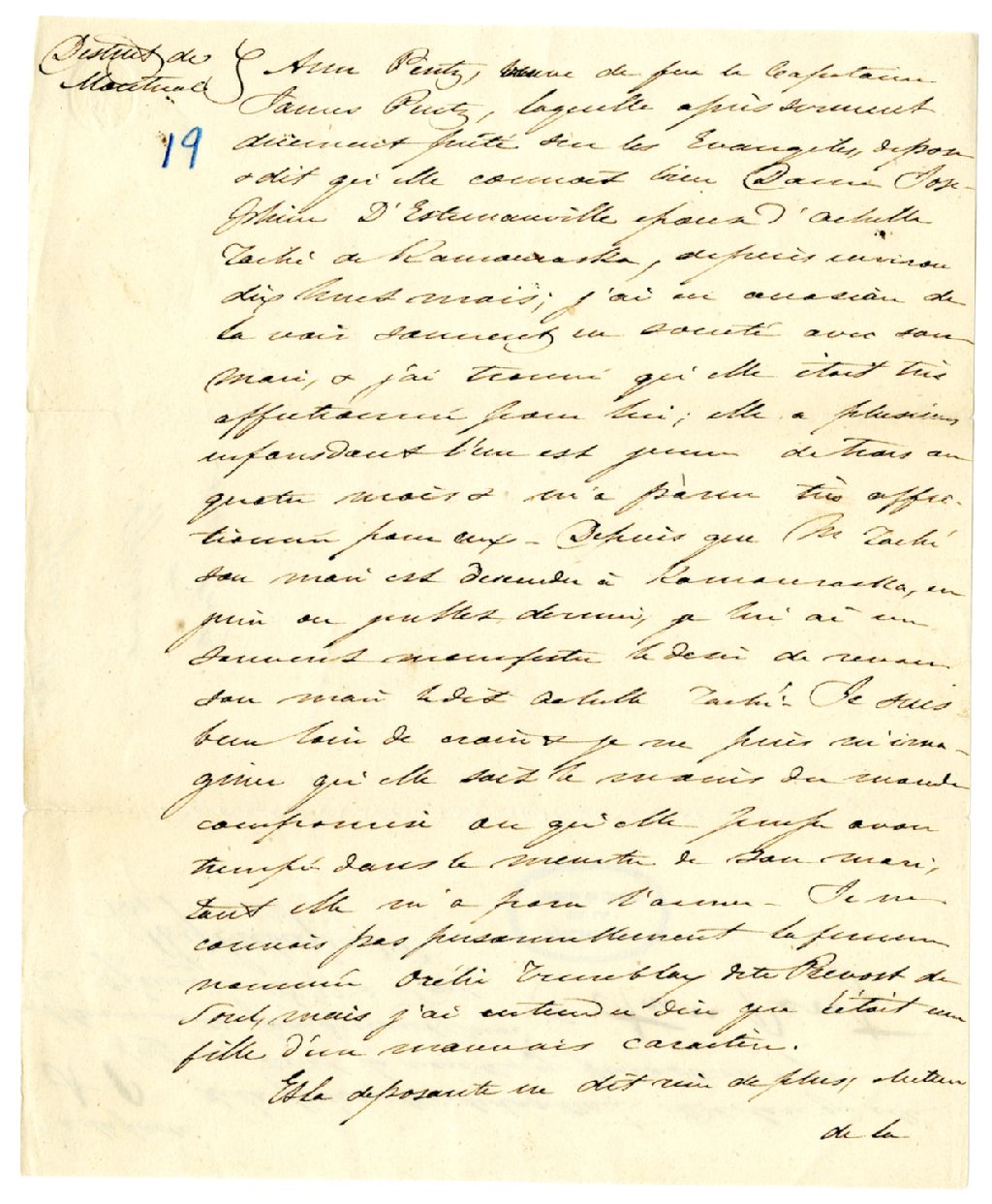 Déposition d'Ann Pentz, veuve du capitaine James Pents de Sorel, 10 février 1839, Archives nationales à Rimouski, Fonds George Holmes, (01R,P107,D2,P19).