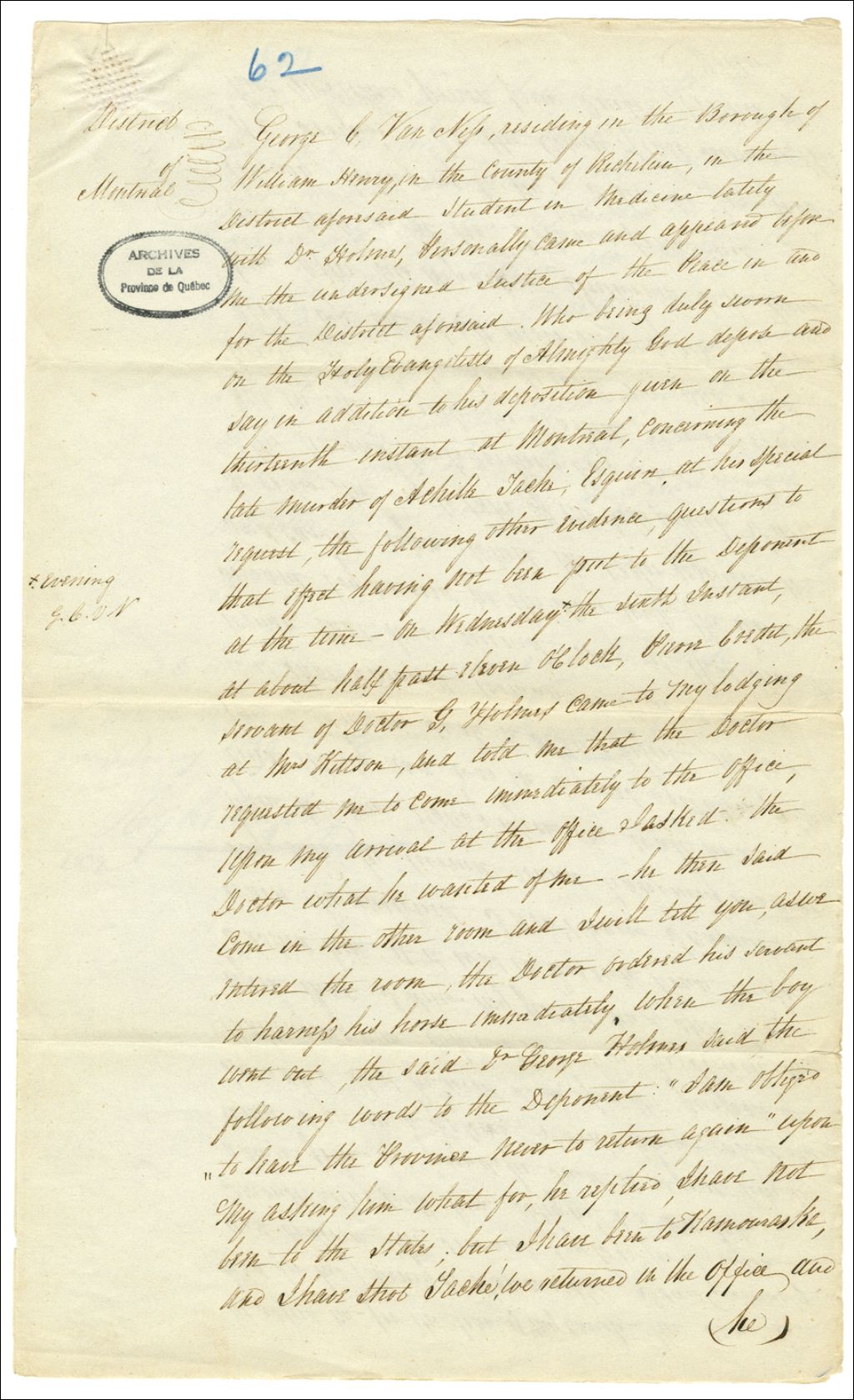 Déposition de George C. Van Ness, de Sorel, 22 février 1839, Archives nationales à Rimouski, Fonds George Holmes, (01R,P107,D2,P62).