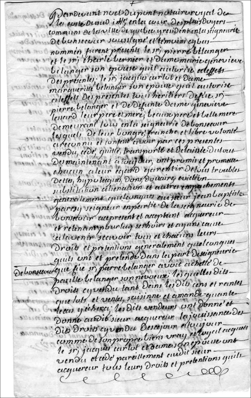 Concession des parts de la seigneurie à Jean-Baptiste Paresy par Pierre Bélanger et ses cohéritiers, 16 avril 1774, Archives nationales à Rimouski, Fonds Seigneurie de Bonsecours, (01R,P48,P23).