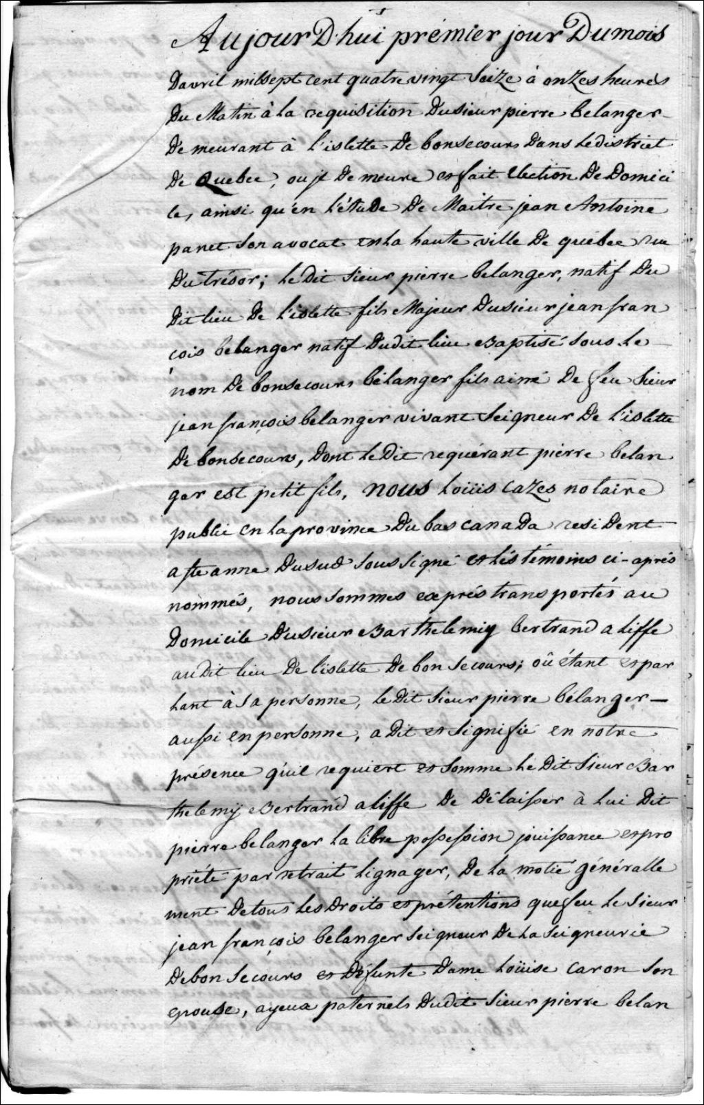 Cession et délaissement de divers droits en la seigneurie de l'Islet de Bonsecours, dans le moulin à farine et autres par Barthelemy Bertrand Alis en faveur de Pierre Bélanger