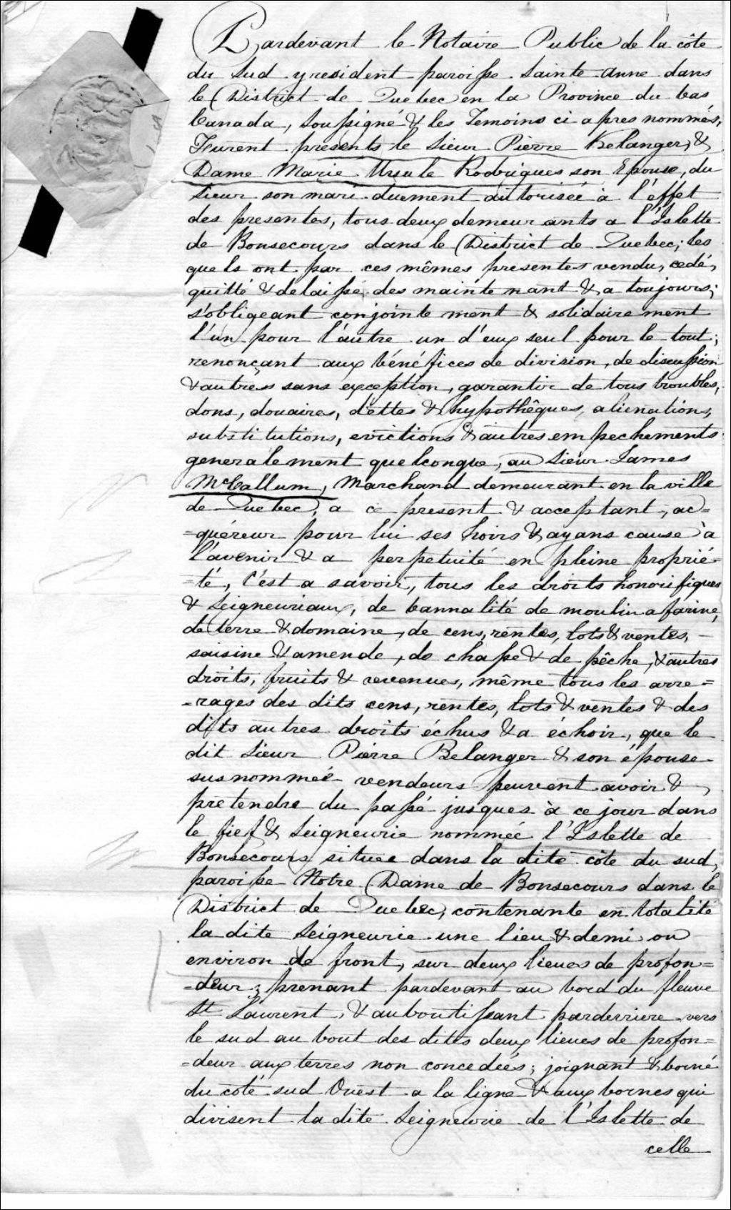 Copie d'un document original concernant la vente des divers droits en la seigneurie de l'Islet de Bonsecours, moulin à farine et autres par Pierre Bélanger et son épouse à James McCallum