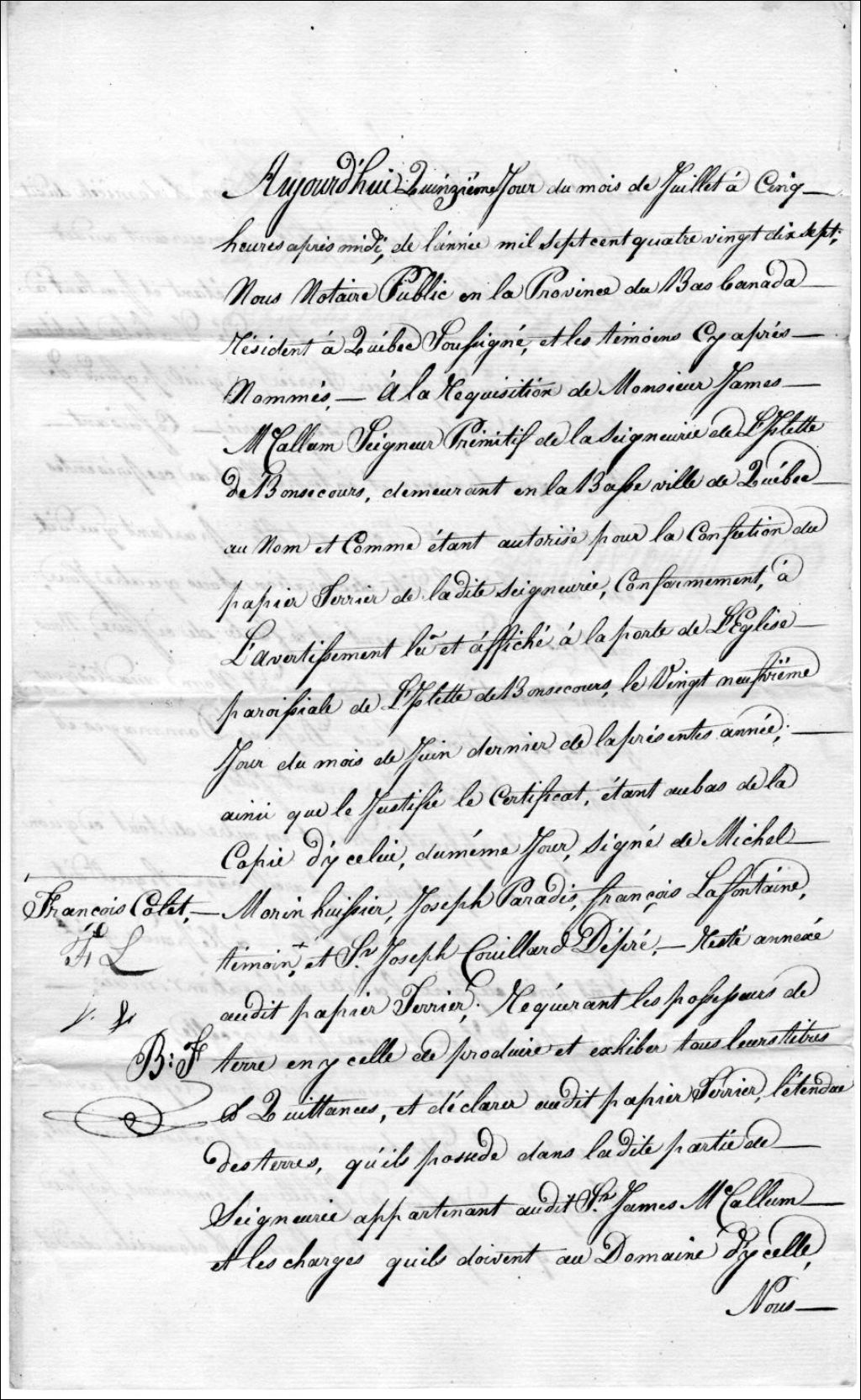 Protêt et sommation faites à la demande de James McCallum à François Normand concernant la clarification d'un titre de propriété, 15 juillet 1797, Archives nationales à Rimouski, Fonds Seigneurie de Bonsecours, (01R,P48,P49).