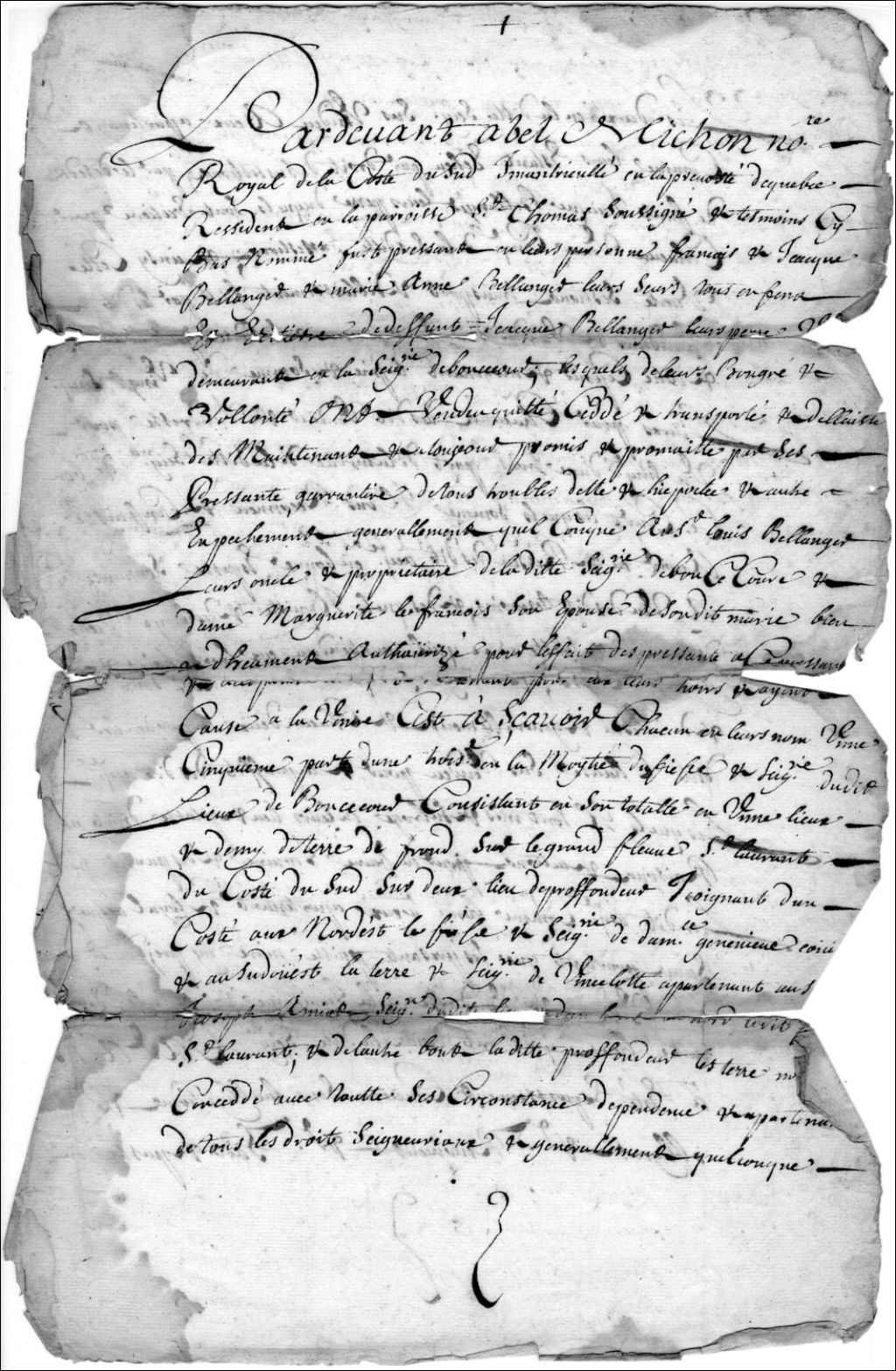 Concession des droits et parts de la seigneurie de Bonsecours à Louis Bélanger par les héritiers de Jacques Bélanger, [Entre 1699 et 1724], Archives nationales à Rimouski, Fonds Seigneurie de Bonsecours, (01R,P48,P5).