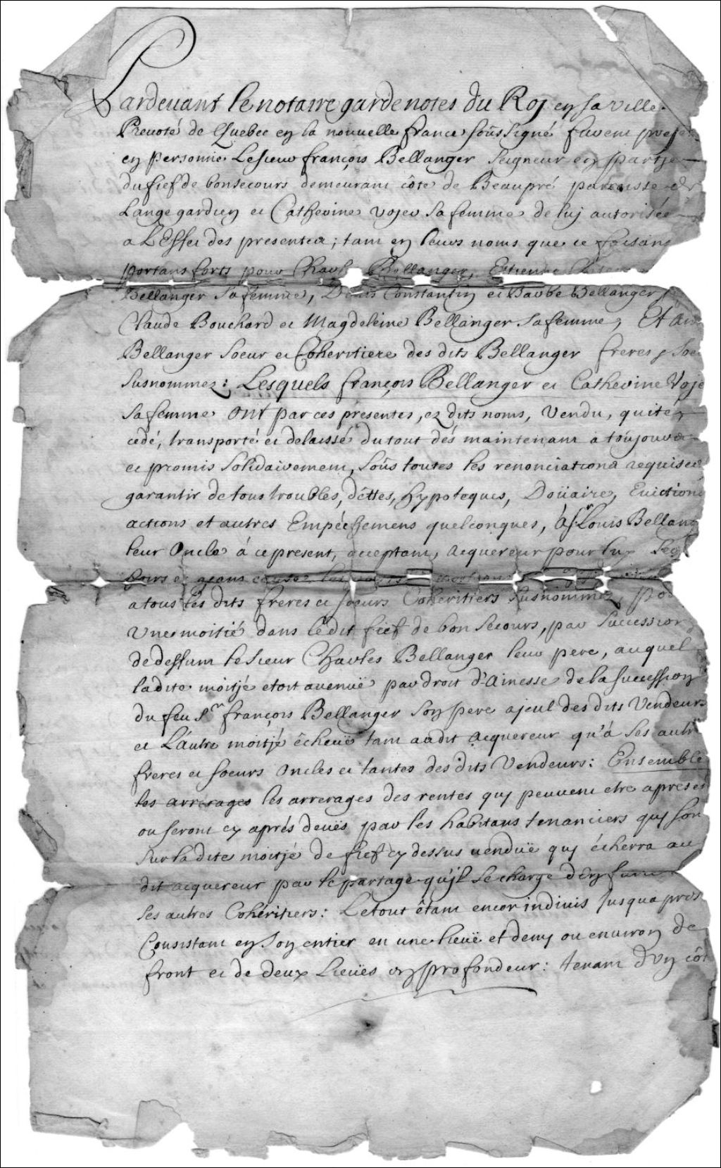 Concession des droits et parts d'héritage de la seigneurie de Bonsecours à Louis Bélanger par les héritiers de Charles Bélanger, 19 avril 1702, Archives nationales à Rimouski, Fonds Seigneurie de Bonsecours, (01R,P48,P7).