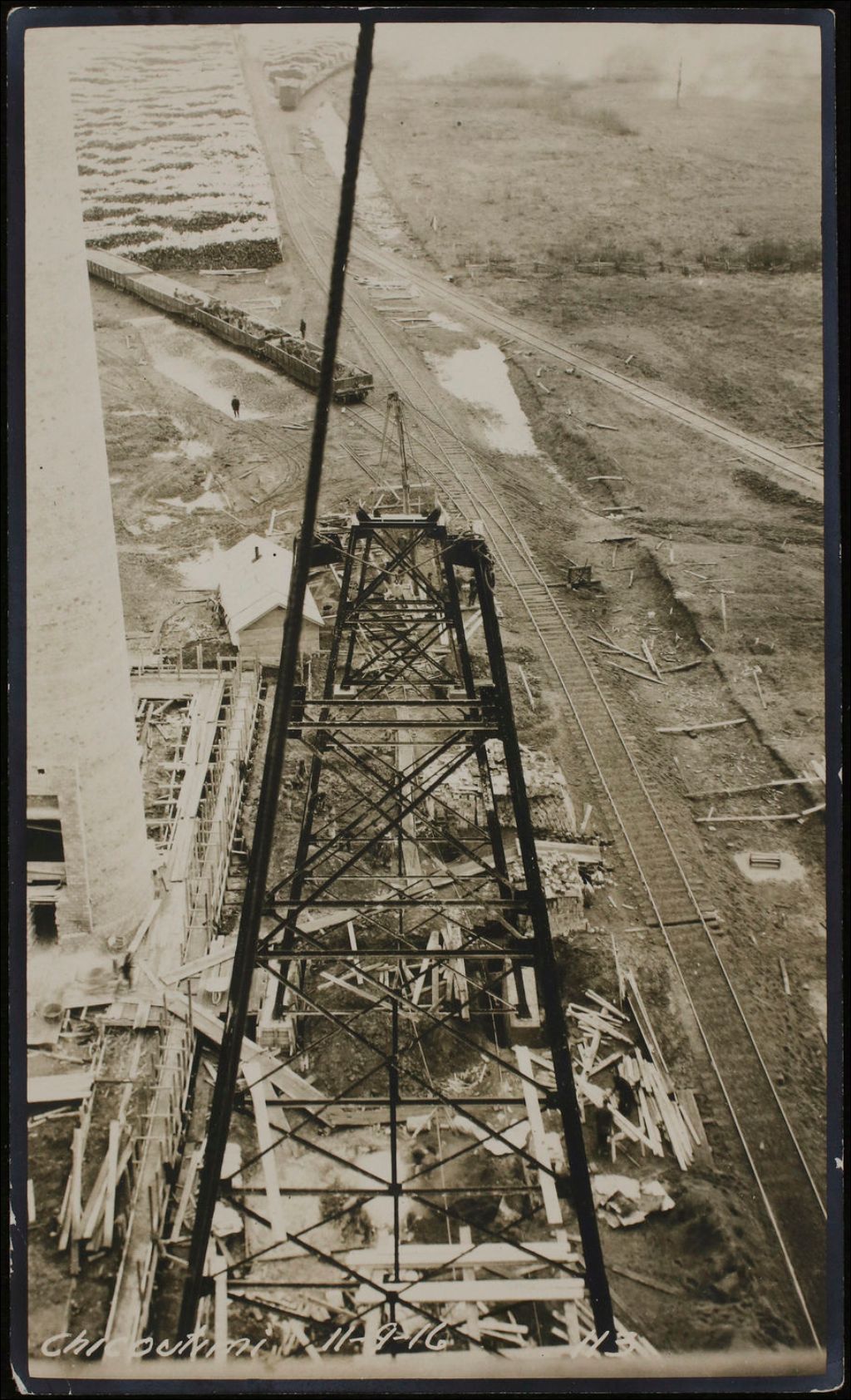 Chip Conveyor from Digester = Convoyeur des copeaux vu du condenseur, 9 novembre 1916, Archives nationales à Saguenay, Fonds Ha! Ha! Bay Sulphite Company Limited, (02C,P139,P113), Photographe non identifié.