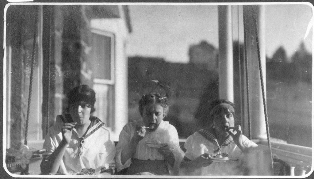 Simonne de V. [Varennes], Anne-Marie Palardy et Marie de V. [Varennes] sur la véranda de la maison de la rue Labrecque - Chicoutimi, [1914], Archives nationales à Saguenay, Fonds Vincent Dubuc, (02C,P60,S1,D1,P104), Dubuc, Vincent.