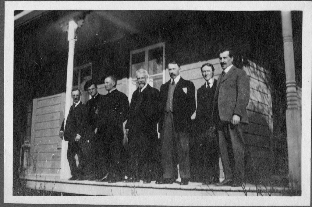 [Vincent Dubuc] et un groupe d'hommes sur la véranda d'une maison