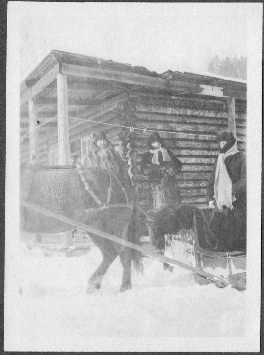 Une femme et deux hommes devant un chalet de bois rond, [191-], Archives nationales à Saguenay, Fonds Vincent Dubuc, (02C,P60,S1,D1,P305), Dubuc, Vincent.
