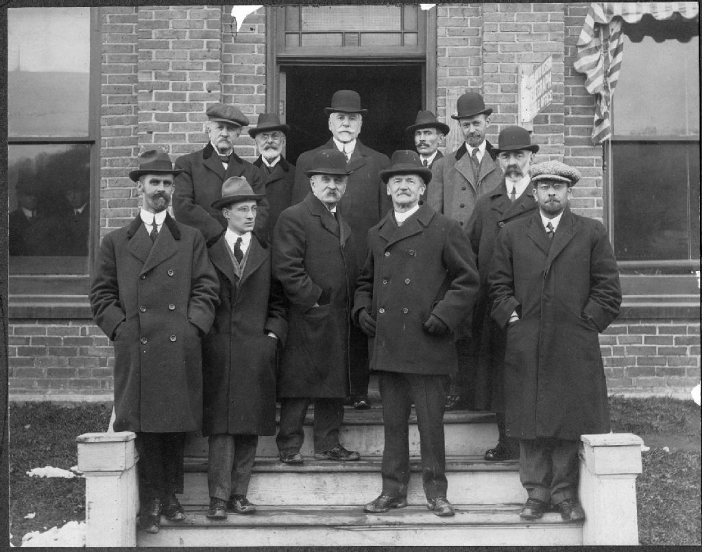 L.P. Sirois, J. Belleau, N. Garneau, Jos Tremblay, J.E.A. Dubuc, Dr Couture, G. Lemoine, Sir Landry, Vincent Dubuc et Jos Cloutier sur le perron du bureau de direction de la compagnie de pulpe de Chicoutimi, [19-], Archives nationales à Saguenay, Fonds Vincent Dubuc, (02C,P60,S1,D3,P11), Dubuc, Vincent.