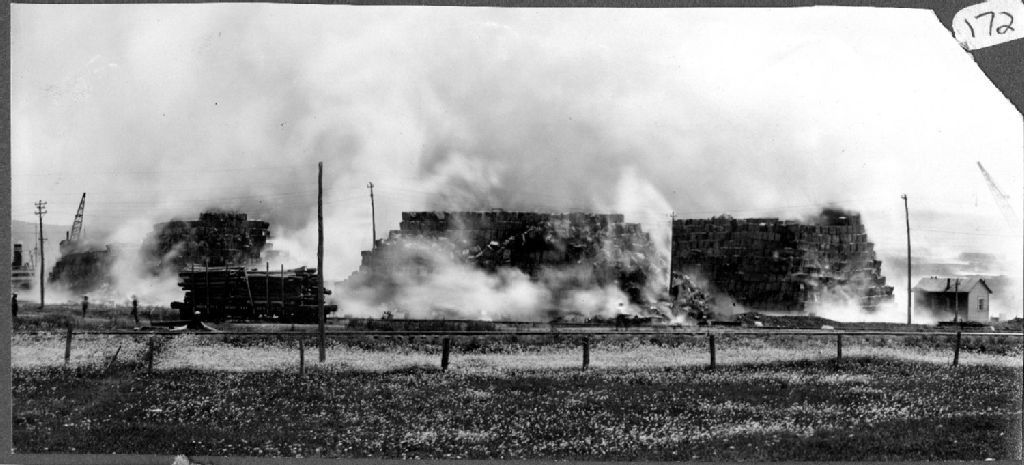 Ballots de pulpes dans le cour de l'usine de Port-Alfred après l'incendie de 1933
