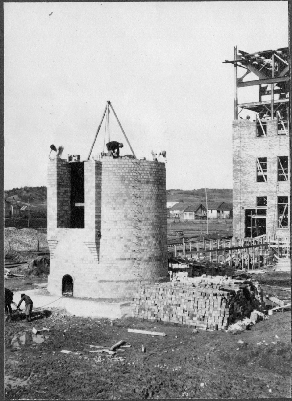 Construction de la cheminée du brûleur de l'usine Ha! Ha! Bay sulphite company à Port-Alfred - Ville de La Baie