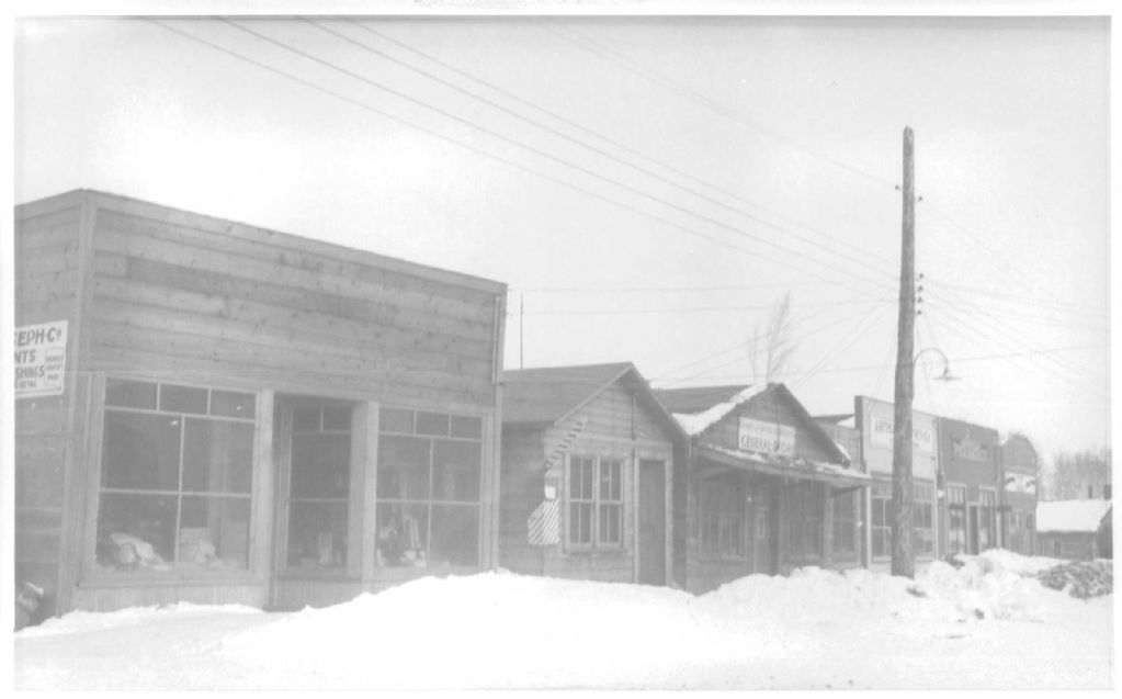Vue d'un ensemble commercial sur la rue Perreault à Rouyn, [vers 1927], Archives nationales à Rouyn-Noranda, Fonds Fonderie Horne, (08Y,P123,S1,P140), Vavasour & Dick.