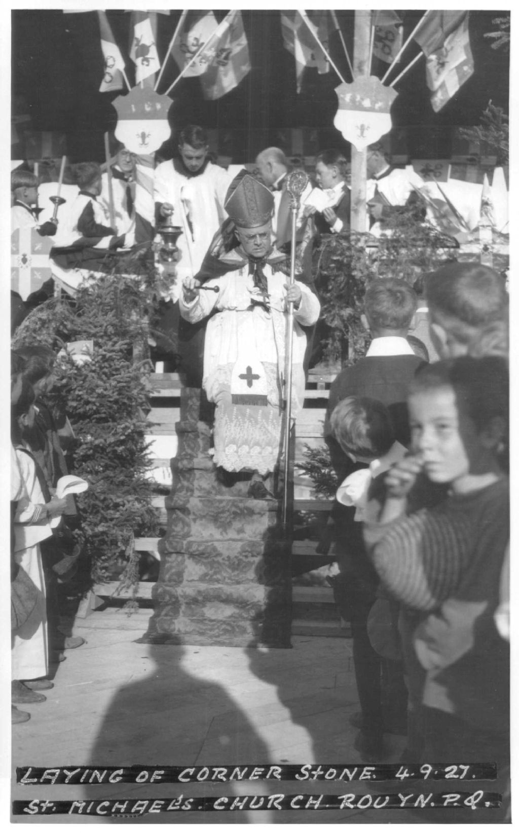 Bénédiction de la pierre angulaire de l'Église St-Michel à Rouyn, 4 septembre 1927, Archives nationales à Rouyn-Noranda, Fonds Fonderie Horne, (08Y,P123,S1,P163), Vavasour & Dick.
