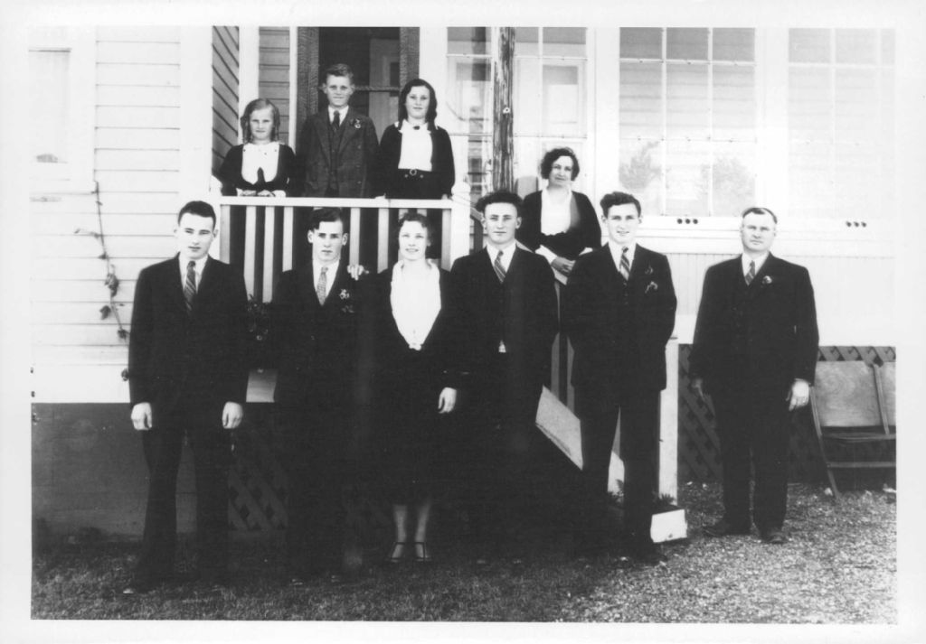 - Photographie de la famille Charlebois devant une maison (probablement sur la rue Noranda, aujourd'hui rue Mgr Tessier). En haut, de gauche à droite : Hélène, Francis Napoléon, Marie-Claire, Clarisse-Marie Brasseur. En bas, de gauche à droite: Eddy, Philippe E., Edna Dubois, Clarence, Don, Edouard Charlebois
