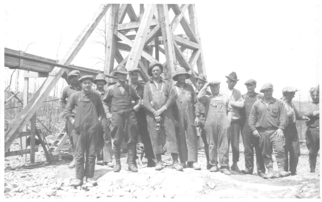 Photographie d'un groupe d'ouvriers de la mine Amulet. À noter au centre, deux mineurs équipés d'un chapeau de caoutchouc et d'une lampe au carbure. Ce type de puit d'exploration, surmonté d'un chevalement de bois démontable, permettait au mineurs de prospecter le sous-sol par une ouverture d'à peine un mètre de diamètre