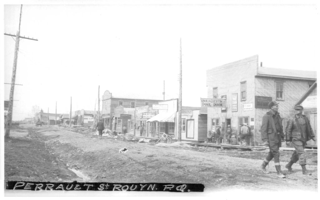 Vue de la partie nord de la rue Perreault entre les avenues Portage et Larivière vers 1927. Il y a un attroupement devant la « Pool Room » d¿Ovila Guertin. On y voit aussi le magasin Canada Paint, le magasin général Lafond, le Sunlight Café et plusieurs autres commerces