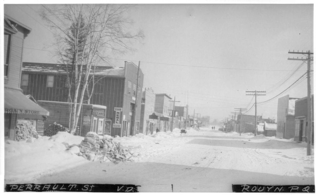 Vue hivernale de la rue Perreault vers 1927-1928. On y voit le Bargain Store, le notaire J.A.R. Proulx, le théâtre Régal et la salle de billards Golden Hall