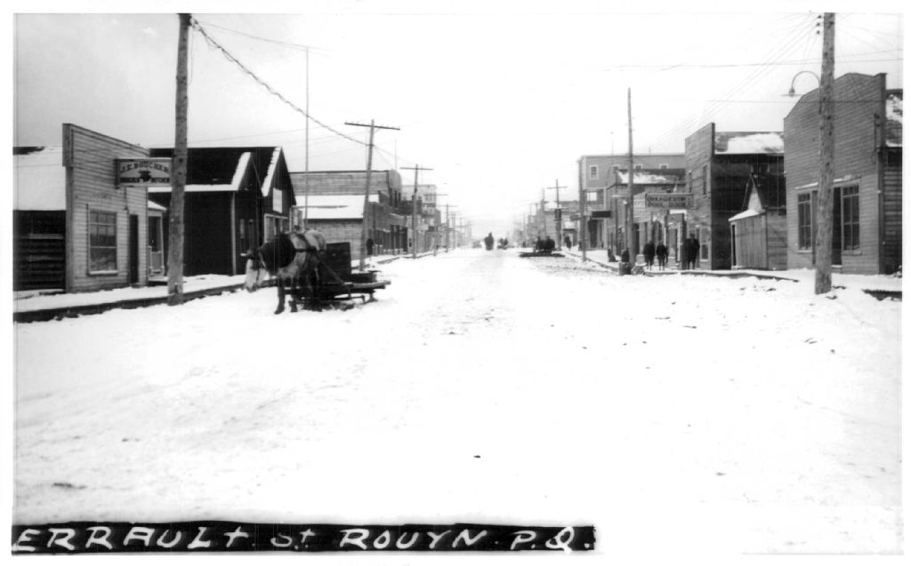 Vue hivernale de la rue Perreault à Rouyn. On y voit la salle de billard d'Ovila Guertin, l'hôtel King et, en arrière-plan, l'édifice de Nelson Pinder au coin de l'avenue Du Portage