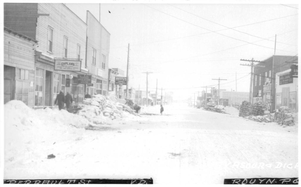 Vue de la rue Perreault à Rouyn en hiver. On remarque la présence de nombreuses cordes de bois devant les différents commerces, dont le restaurant Caplan's, le Rexall Drug Store et le Siegel's