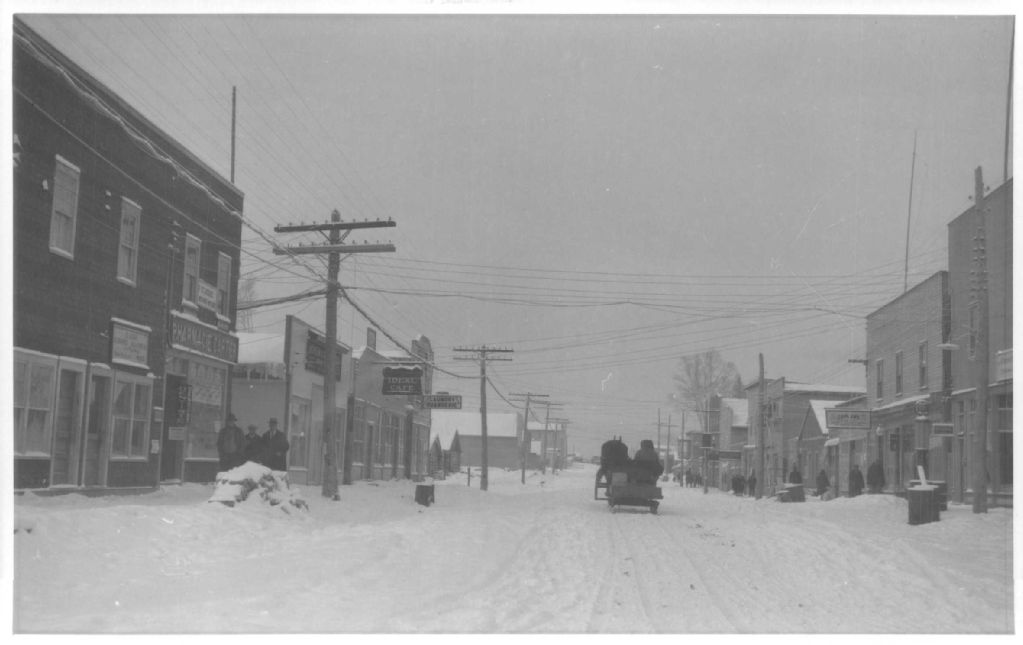 Vue de la rue Perreault à Rouyn en hiver, [entre 1928 et 1930], Archives nationales à Rouyn-Noranda, Fonds Fonderie Horne, (08Y,P123,S1,P94), Vavasour & Dick.