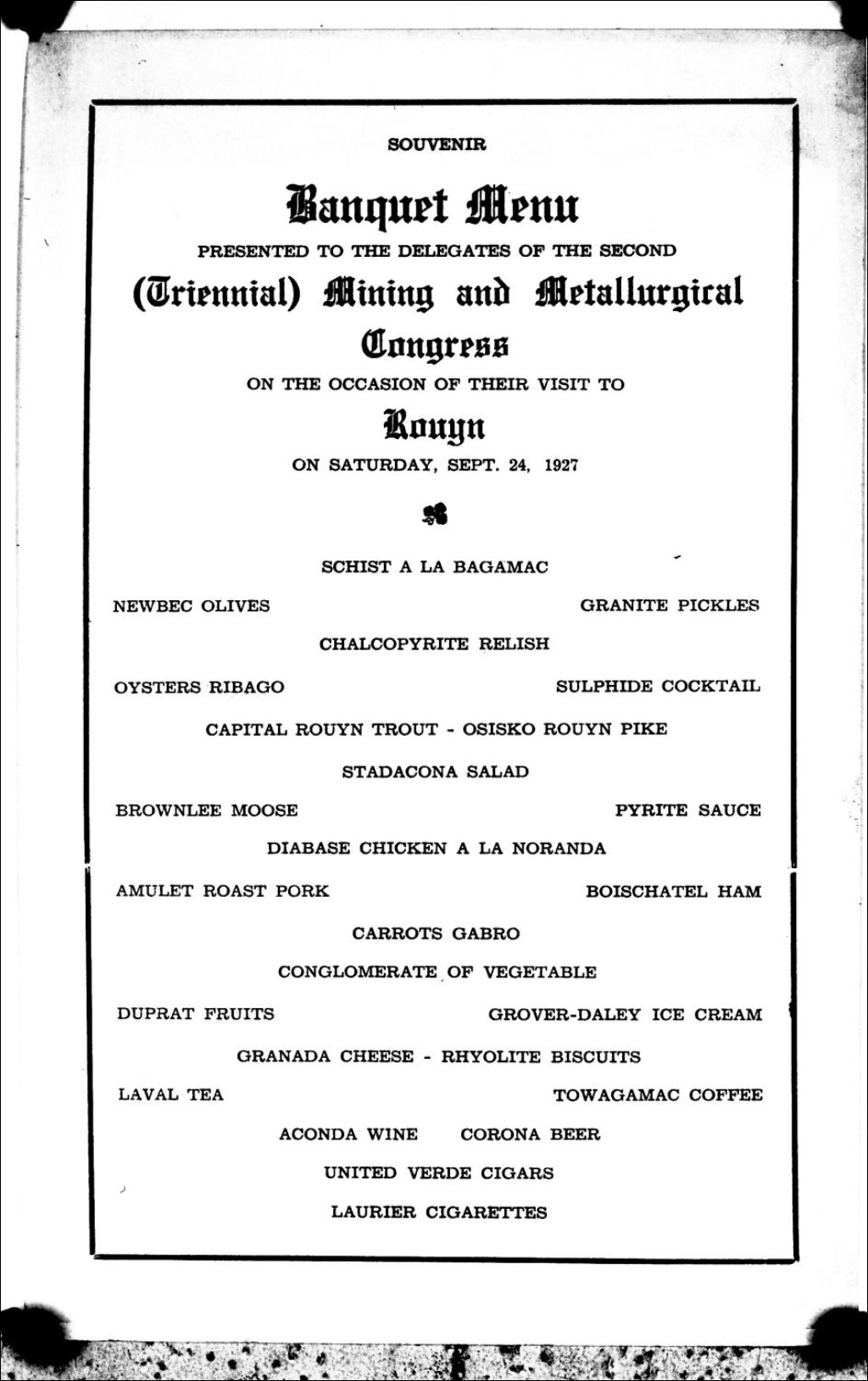 - Ce dossier comprend des photographies, prises entre 1927 et 1944, de la Mine Noranda, Fonderie Horne (Xstrata Cuivre). Différents sujets y sont représentés: vues extérieures générales, coulé du cuivre dans les convertisseurs, sortie des mineurs à la fin de leur quart de travail, menu spéciale pour un banquet en 1927. Les photos de 1927 sont des inter-négatifs