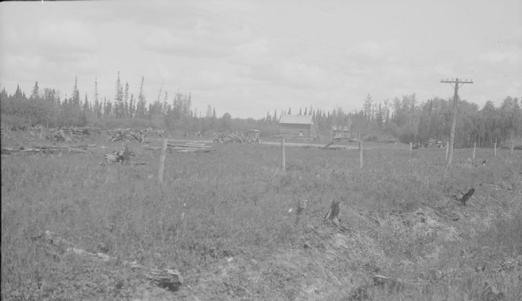 Lot d'un colon avec une maison en bois, Abitibi., 1940, Archives nationales à Rouyn-Noranda, Fonds Canadien National, (08Y,P213,P13), Canadien National.
