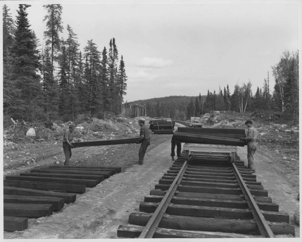 Travailleurs transportant les traverses du chemin de fer Chibougamau - Saint-Félicien, 1956, Archives nationales à Rouyn-Noranda, Fonds Canadien National, (08Y,P213,P149), Canadien National.