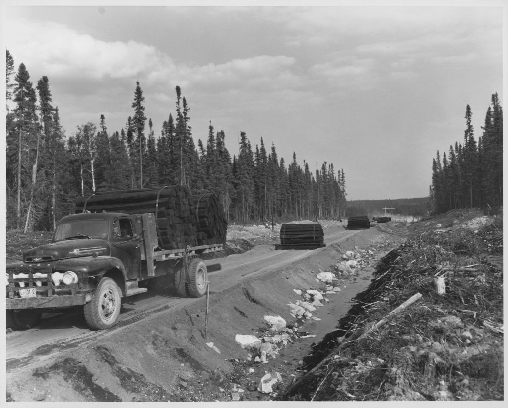 Camion transportant les traverses du chemin de fer Chibougamau - Saint-Félicien