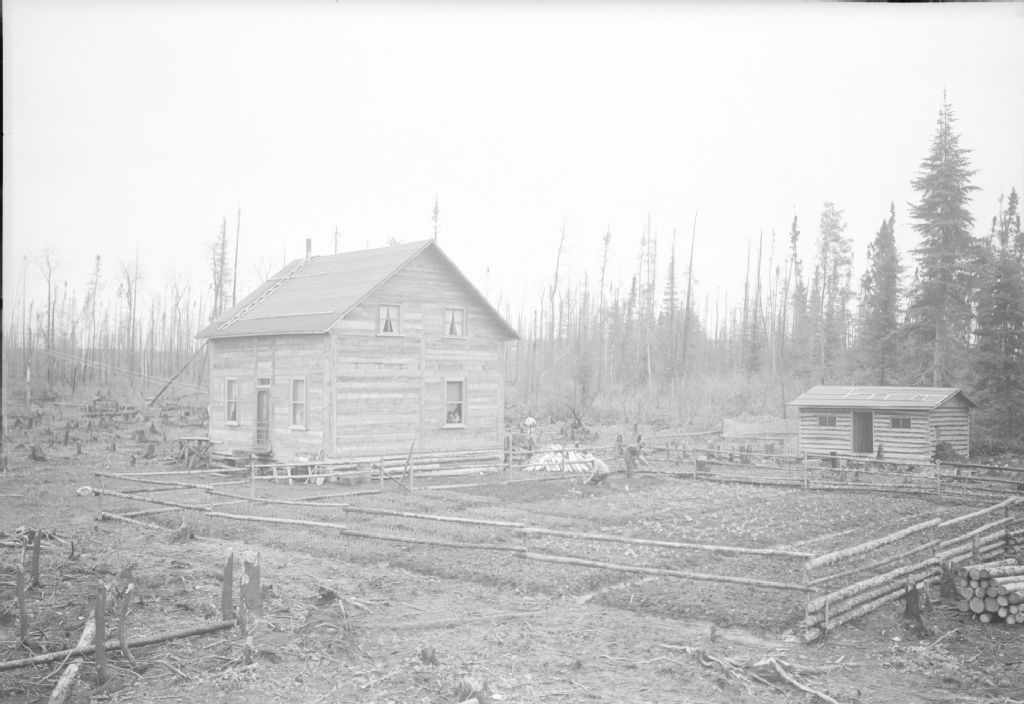 Maison avec deux personnes travaillant au jardin, Abitibi.