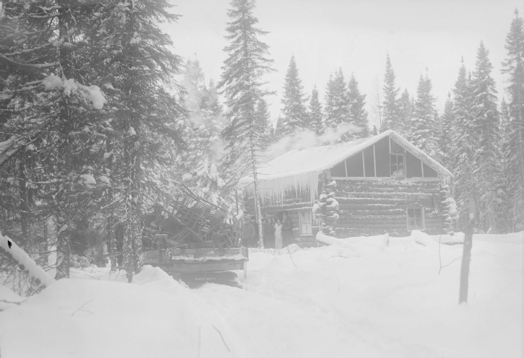 Une famille de colons de Laferté devant leur maison en bois rond en hiver