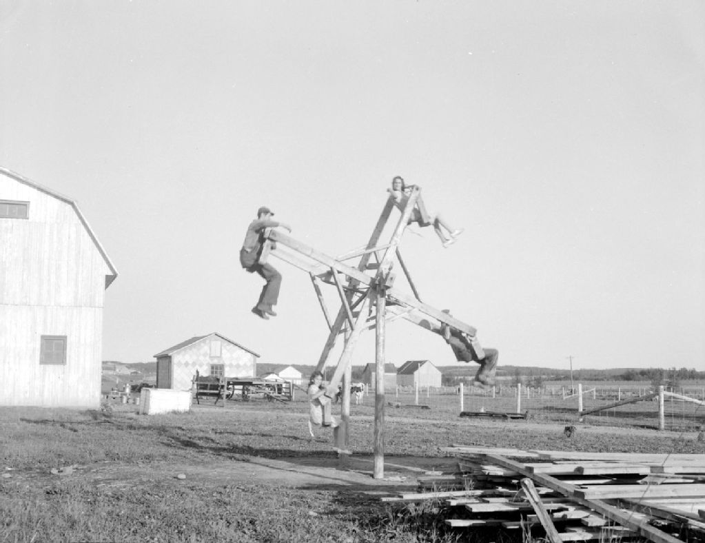 Enfants jouant dans un manège en bois à Macamic, 1943, Archives nationales à Rouyn-Noranda, Fonds Canadien National, (08Y,P213,P295), Canadien National.