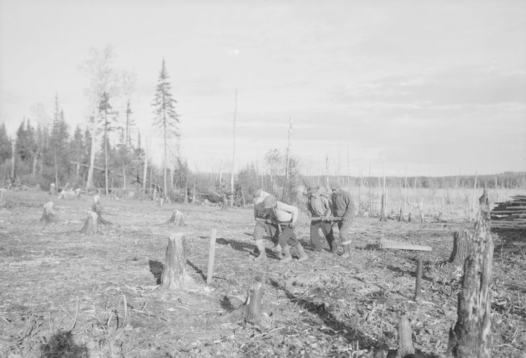 Hommes nivelant le sol à l'aide d'une herse triangulaire, Abitibi