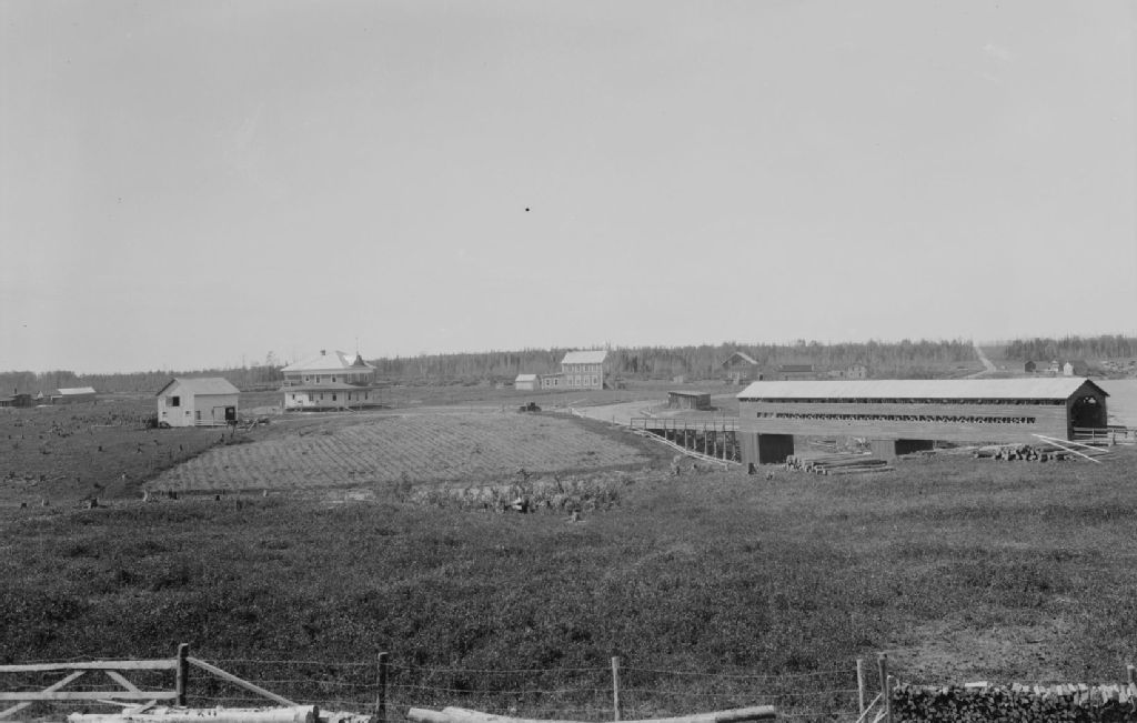Le pont couvert sur la rivière Dagenais, le presbytère et l'école à Palmarolle