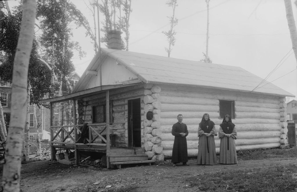 Deux religieuses et Albert Pelletier devant un maison de bois rond à Rouyn