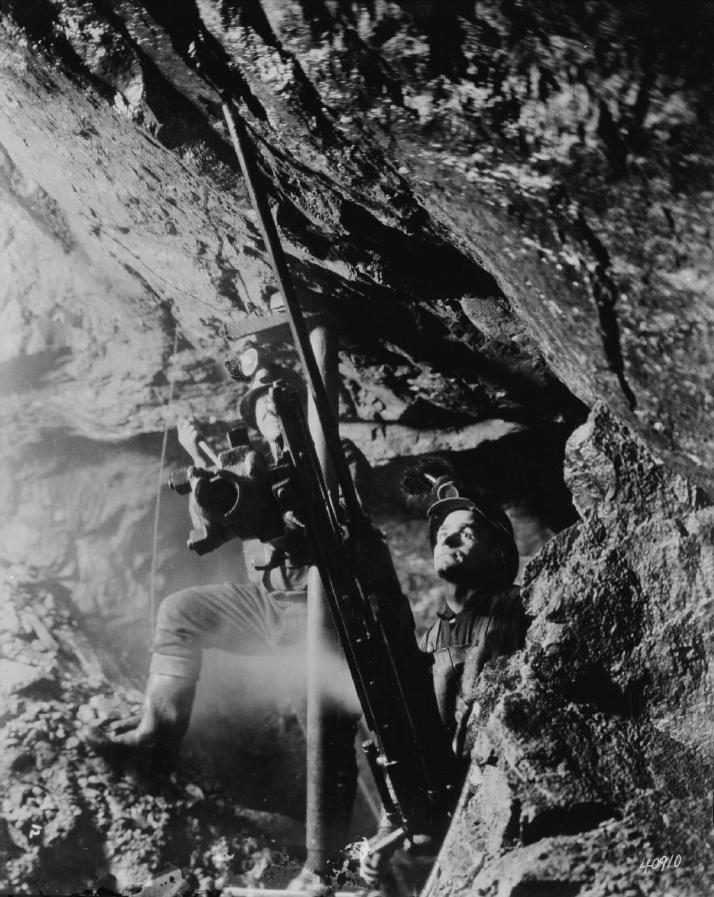 Mineurs opérant un marteau perforateur sur béquille dans une galerie de la Mine Noranda