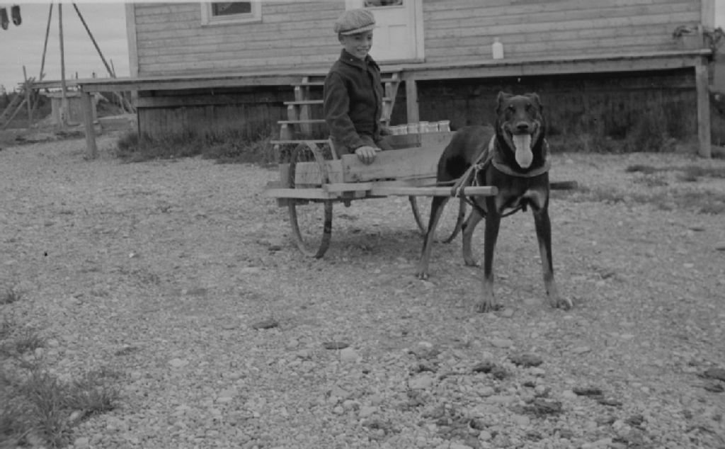Un enfant assis sur une charette tirée par un chien qui transporte des pintes de lait, Abitibi.