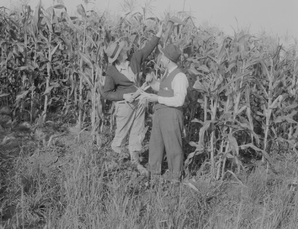Deux hommes dans un champ de maïs à la Ferme Blais, Saint-Marc, Abitibi., [entre 1930 et 1950], Archives nationales à Rouyn-Noranda, Fonds Canadien National, (08Y,P213,P89), Canadien National.