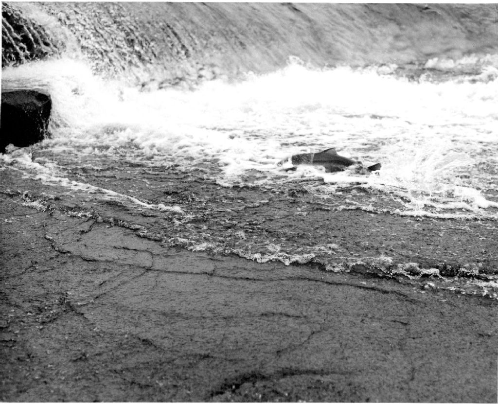 Saumon dans la rivière, Vers 1980, Archives nationales à Sept-Îles, Fonds Mitchell Campbell, (09N,P41,S4,P32), Campbell, Mitchell, gérant Club de pêche Moisie, époque 1936-1980.