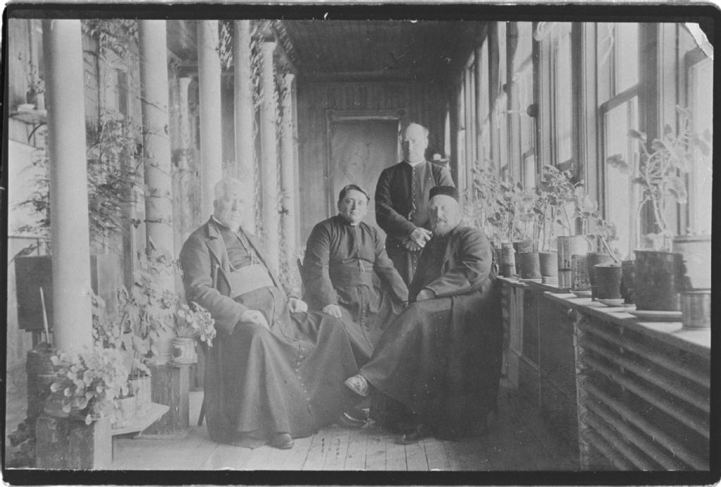 Monseigneur Gustave Blanche, Père Arthur Divet et deux confrères à l'intérieur de l'évêché de Sept-Îles, Négatif reproduit en 1984(original créé vers 1910), Archives nationales à Sept-Îles, Collection Société historique du Golfe, (09N,P6,S3,D4,P1006), Société historique du Golfe.