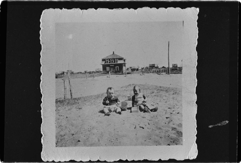 Renée et Thérèse Beaudin devant la maison de Joseph Frank Beaudin, Négatif reproduit en 1984 (original créé vers 1952), Archives nationales à Sept-Îles, Collection Société historique du Golfe, (09N,P6,S3,D4,P407), Société historique du Golfe.