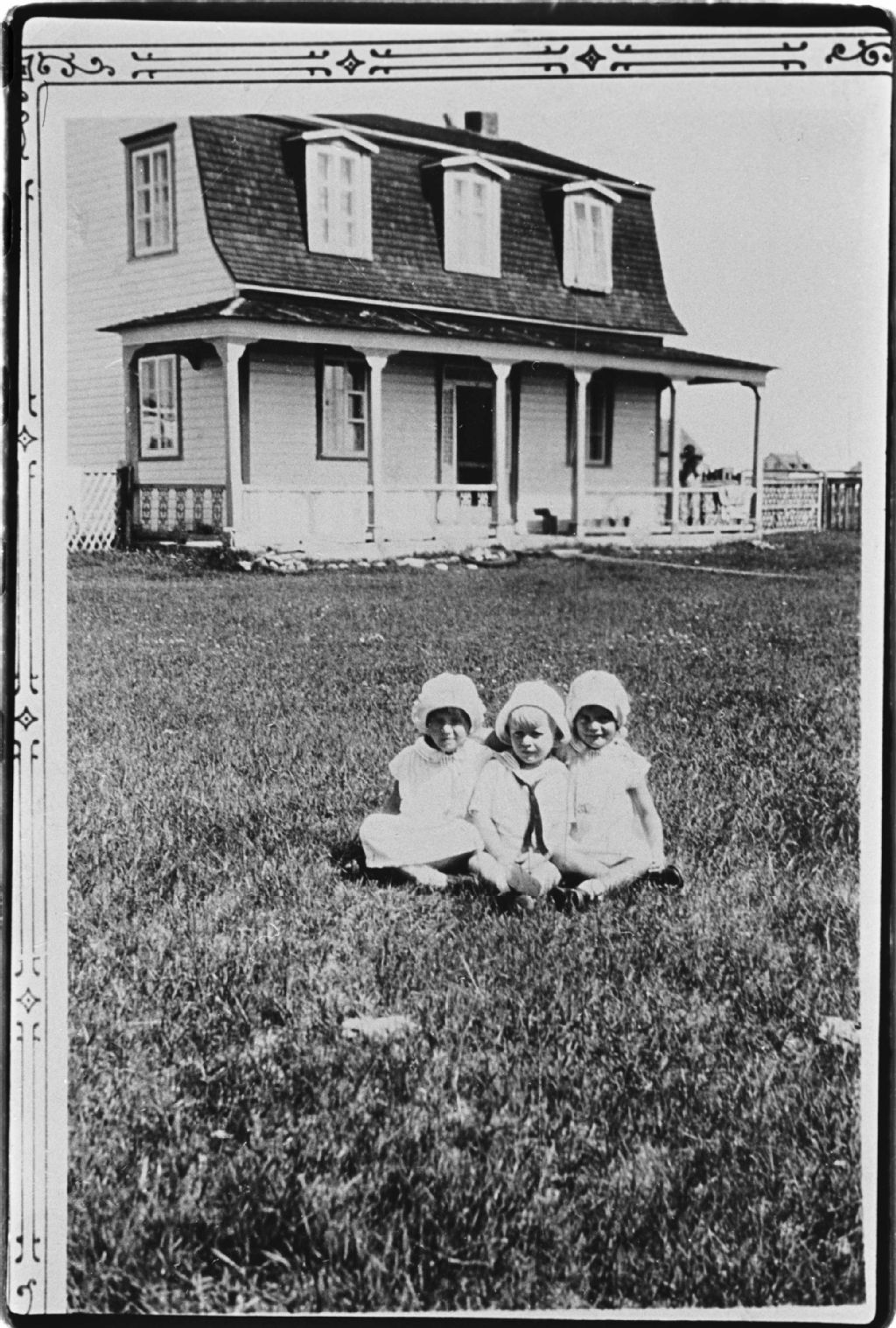 Madeleine, Guy et Denise Bois, enfants d'Antonio Bois, devant la maison de Paul-Édouard Vigneault
