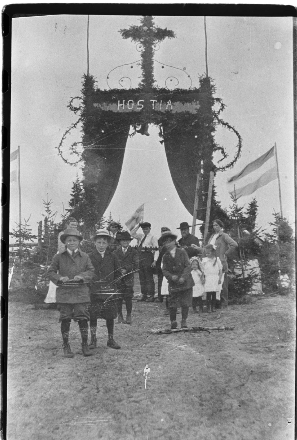 Reposoir de la Fête-Dieu à Sept-Îles, Négatif reproduit en 1984 (original créé en 1917), Archives nationales à Sept-Îles, Collection Société historique du Golfe, (09N,P6,S3,D4,P470), Société historique du Golfe.