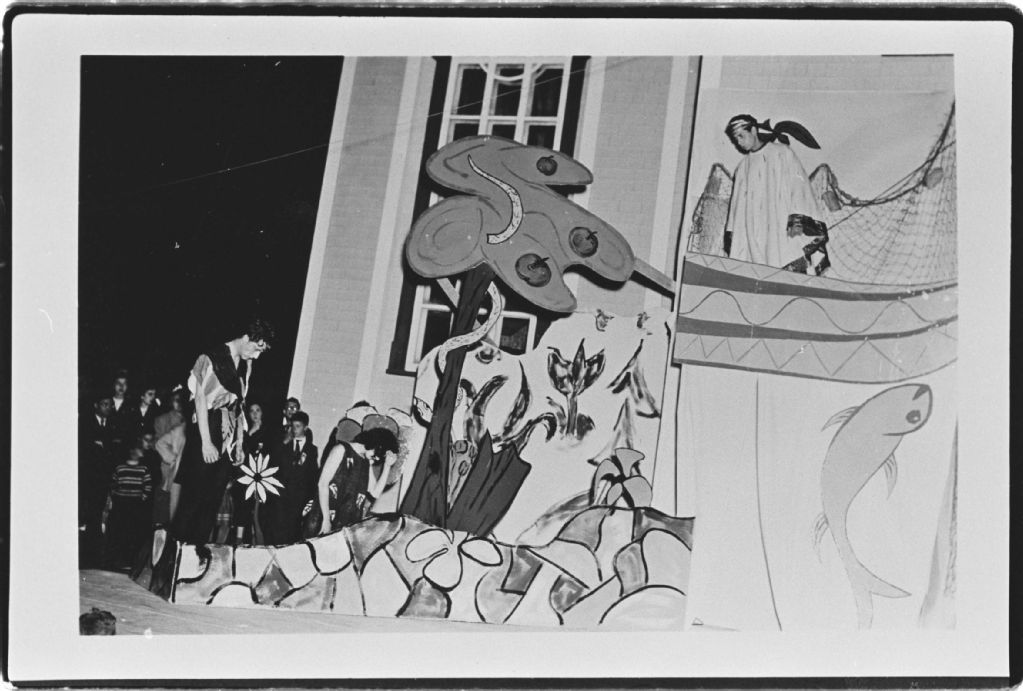 Décorations à l'extérieur de l'église Saint-Joseph lors des fêtes du tricentenaire de Sept-Îles, Négatif reproduit en 1984 (original créé en 1951), Archives nationales à Sept-Îles, Collection Société historique du Golfe, (09N,P6,S3,D4,P51), Société historique du Golfe.